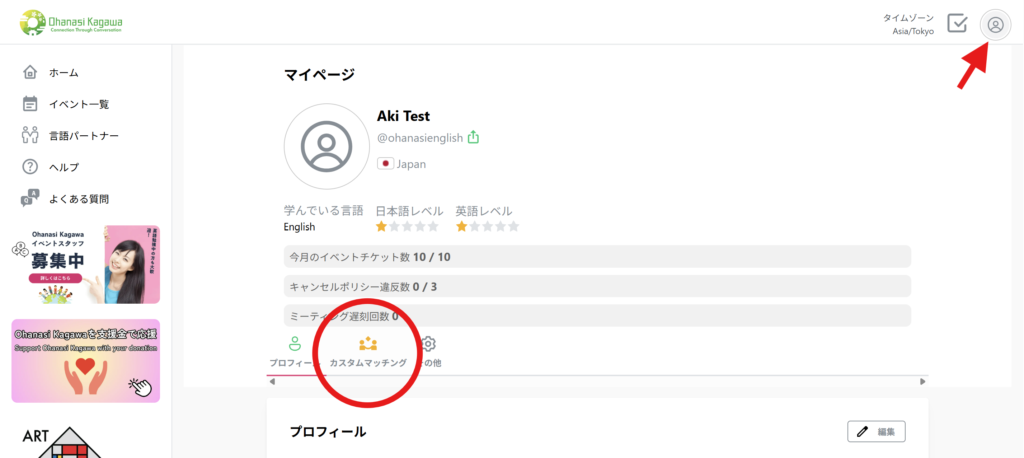 そしたら、プロフィールの横にカスタムマッチングの表示とアイコンがありますのでそちらをクリック