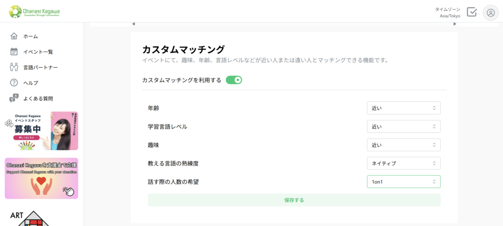 『カスタムマッチング機能』とは、Ohanasi Kagawaのイベントで自分が希望する相手の言語レベルや年齢、趣味などに近い方とマッチして会話ができるようになる機能になります。