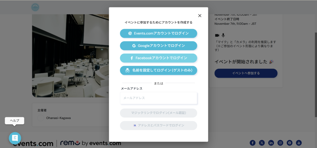 イベント会場へ入室をしようとする時にイベント会場に参加するためのアカウント作成が必要となります。