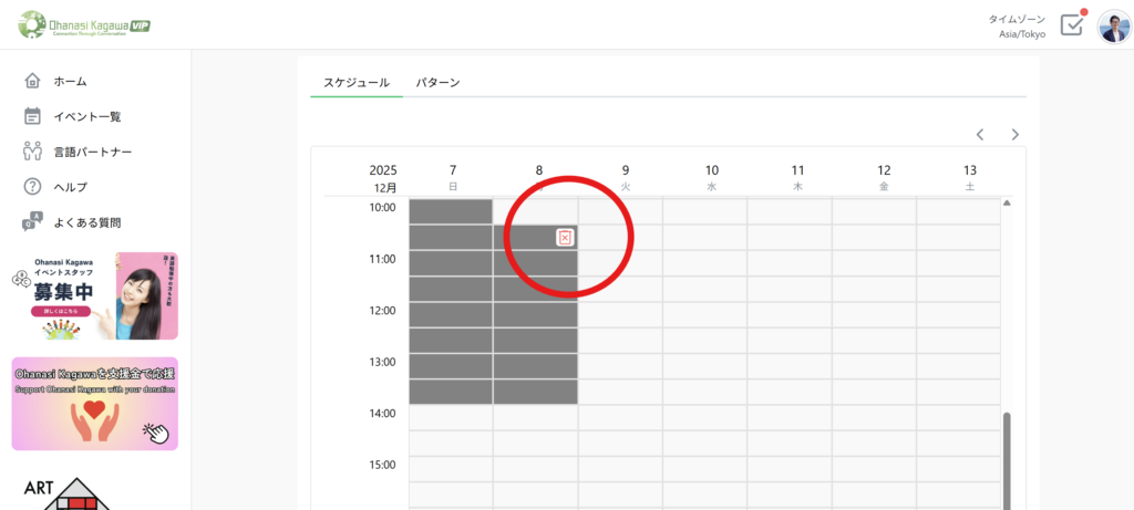 自分がクローズしたいセルをクリックしてSettingのボタンを押すと、セルがグレーになり、その時間は言語パートナーの方が予約することができなくなります。(ファーストコンタクト・言語パートナー成立中の時のみ)