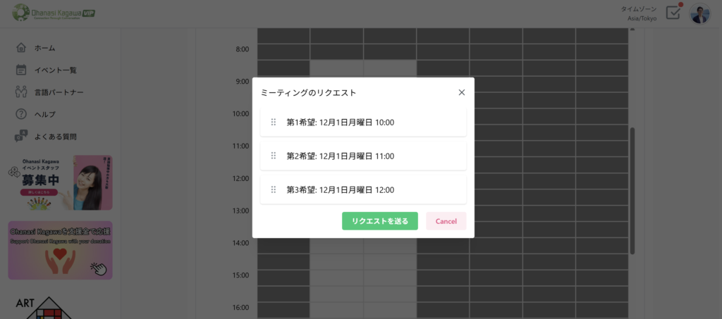 言語パートナー成立後はお互いのカレンダーからいつでも話したいミーティング時間のリクエストを送ることができ、いつでも会話を楽しめるようになります。