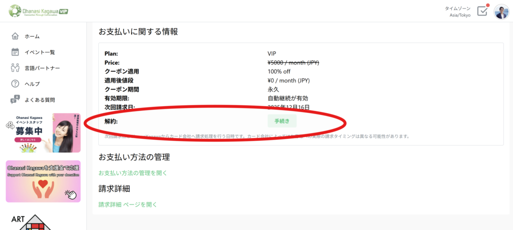お支払いに関する情報ページで解約ところにある手続きのボタンをクリックするとサブスクリプションがキャンセルします。 サブスクリプションがキャンセルしても次のお支払い日まではサービスを利用することが可能です。