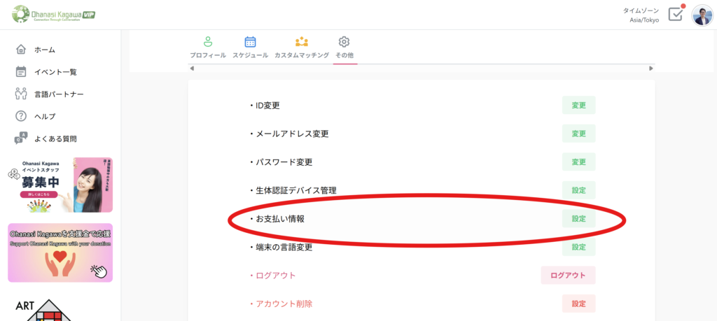 Ohanasi KagawaのWebアプリにアカウント登録できて、ログインできたら左側にあるホーム、イベント一覧の下にある言語パートナーというタブをクリックしましょう。