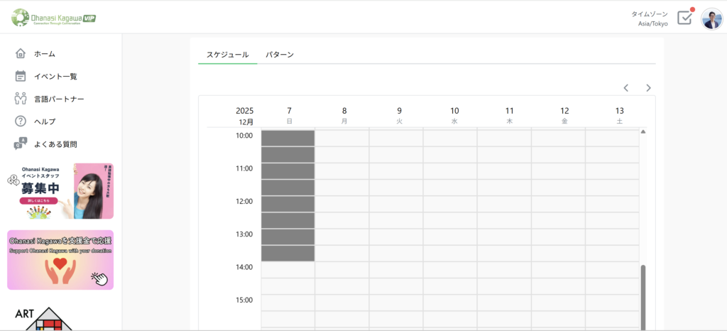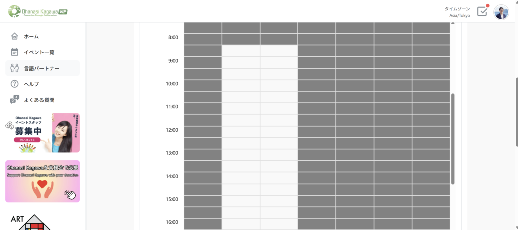 – 自分が言語パートナーの方と話したい空き時間をカレンダーで設定します。こちらの空き時間に言語パートナーからのミーティングリクエストが届くようになります。